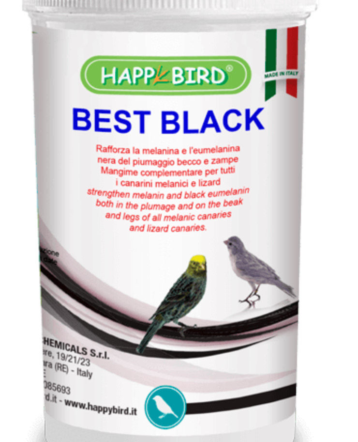 Rafforza la melanina e l’eumelanina nera del piumaggio becco e zampe.